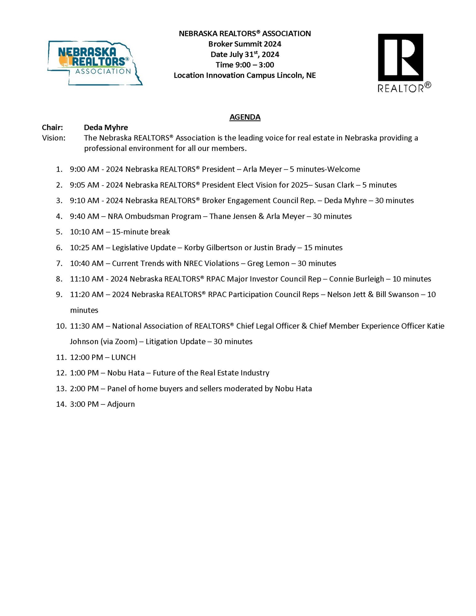 Brokers, come join us on July 31st live at UNL Innovation Campus in Lincoln, NE or via ZOOM for the Nebraska REALTORS® Association 2024 Broker Summit featuring one of the industry’s brightest minds, Nobu Hata https://about.me/nobuhata. Also, Katie Johnson, NAR’s Chief Legal Counsel, ( https://www.nar.realtor/katie-johnsonwill ) be giving a brief update on the Class Action Lawsuit and Settlement . This event is FREE & lunch is included for live attendees. Sorry Zoomers, you’ll have to make your own sandwich. 😉