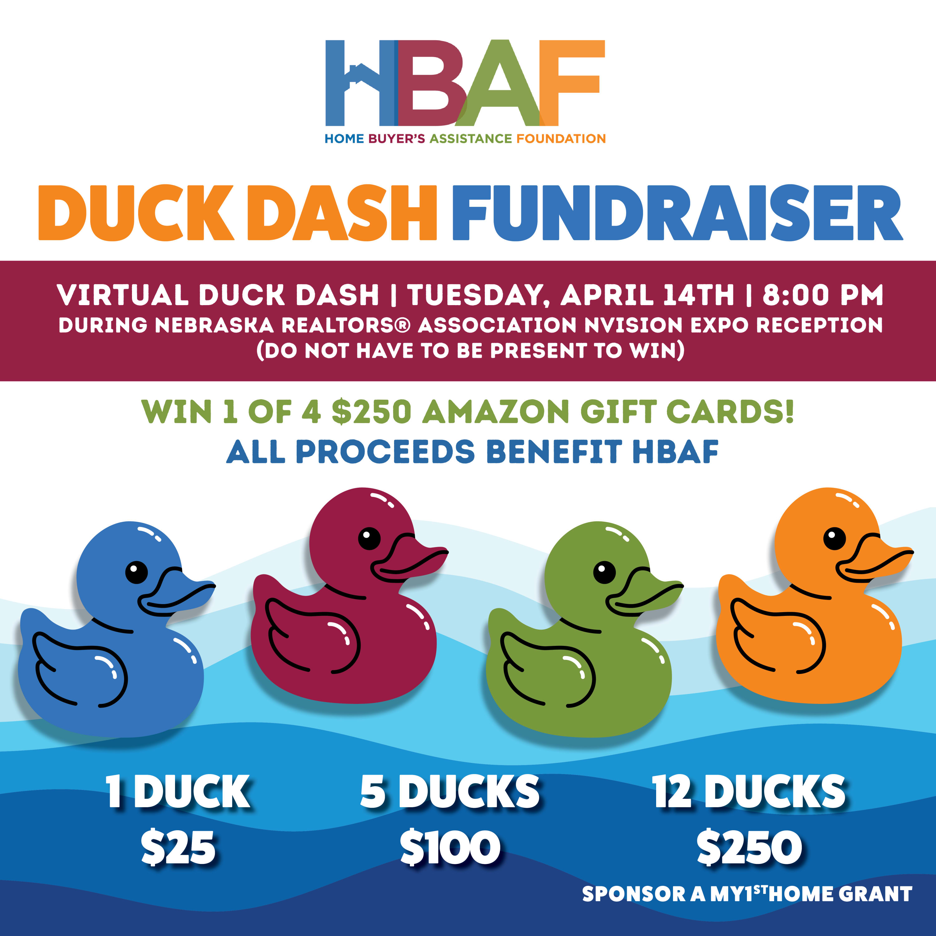 Every duck you adopt boosts your chances to win—and helps support the Home Buyers Assistance Foundation.